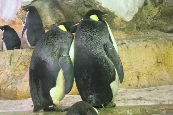 アドベンチャーワールドの仲良しエンペラー、相方にもたれかかってお昼寝中。少し前に出したキングのペアと同じやり方ですね。エンペラーは体重30キロくらい、アドベンチャーの最大個体は40キロあるそうです。