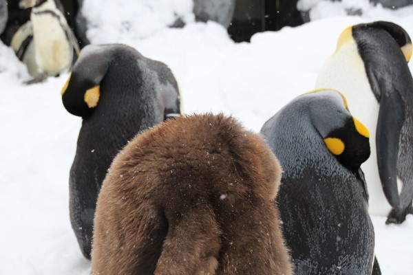 ヒナは向かって左がハラ側です。右フリッパーに後ろからクチバシをはさんでいるので、右側2羽のオトナがヒナと同じ姿勢で、特に右奧のオトナは身体の向きも同じ。ヒナのモコモコ幼綿羽は長いので身体が大きく見えます。旭山動物園。