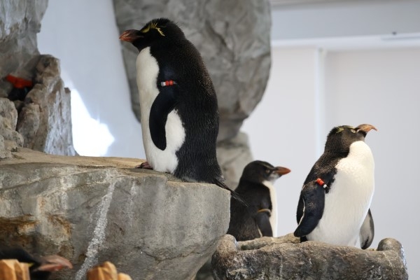 海遊館のイワトビたちを観察してみましょう。手前に立っている2羽と奧の1羽とは雰囲気が違います。配色もクチバシの形も。奧のイワトビは亜成鳥で、まだ顔の一部がまっ黒になっていませんし、黄色い『眉』は出て来ましたが、カンザシ状の冠羽はありません。そして、クチバシがつるんとした形をしているのは若いしるし。年をとると、特にイワトビやマカロニは、クチバシがごつごつガサガサして大きくなり、先端が伸びて曲がることがとても多いです。2025/07/15