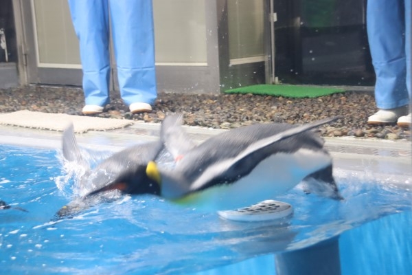 越前松島水族館のキング、お散歩帰りに一泳ぎの図。足で身体を蹴り出して、勢いよく飛び込みます!が、手前のジュウゴ君、水中から突き出た排水口にぶつかるんじゃ?大丈夫?