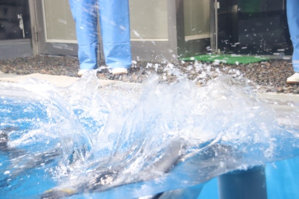 でも大丈夫。ジュウゴ君、飛んでいます。隣で飛びこんだハッちゃんよりもずいぶん遠くまでいきます。