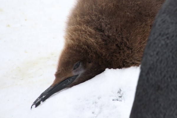 旭山キングひな、雪に寝そべって冷え冷えを楽しんでいます。アーモンド型の目が人っぽい。