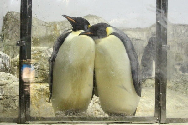 アドベンチャーワールドのエンペラー、アクリル囲いにもたれかかって、さらに相方にもたれかかって、お昼寝中。囲いの中にいるヒナ一家を熱心に視察していて疲れたのかも。