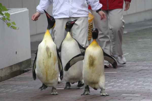 「いざ、パレードじゃ!」威風堂々と現れたキング、2羽はハラがヨゴレ放題。たまたま床のヨゴレた所に寝転がってしまったのですね。パレードに出られる(向いている)キングは数が限られているので、こういうことも。ハラは白いけど地味な色合いのキングは亜成鳥です。アドベンチャーワールドにて。