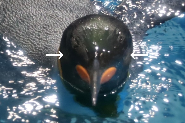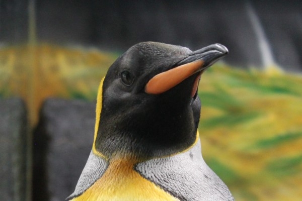 美女王ハッちゃんのご尊顔でございます。キングペンギンはわりと彫りの深い(デコボコ)顔をしています。目は、だいたい上下クチバシの合わせ目(オレンジ部分の上辺)の延長線上にありますね。口を開けると目のすぐ前からパックリ開くことになります。