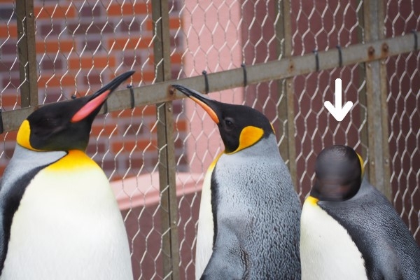 登別マリンパークニクスでキングの写真にアヤシイ覆面姿が写りました。亜成鳥の黄緑ちゃん、シャッタースピード100分の1秒では追いつかない速さで首をブルッと一振り。