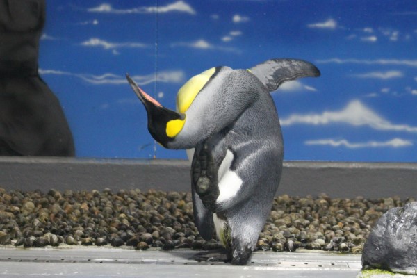首筋の後ろ側がかゆい場合は、伸ばした首を大きくひねって掻きます。バランスも素晴らしい。モデルは越前松島水族館のヨン君でした。