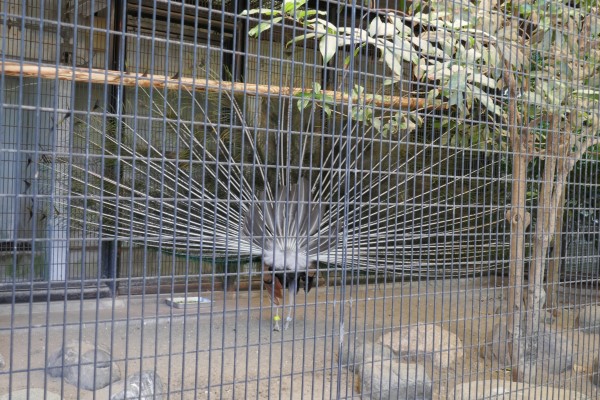 野毛山動物園で見事なクジャクを見かけました。羽を広げる求愛行動をしていました。