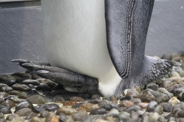 キングの、ちょっと恐竜めいた足に鋭いピカピカ爪。指先が上がっているのは、いわゆる『かかと立ち』しておやすみ中のポーズ。越前松島水族館の女王ハッちゃん。