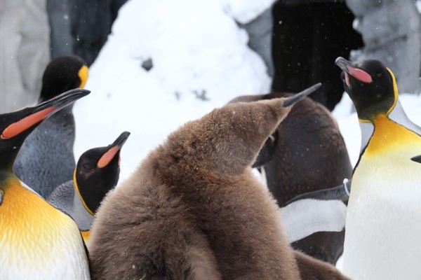 旭山キングのヒナ、周囲の野次馬を自力で追い払っているところ。もう『中身』はオトナサイズ、クチバシもご覧の通り。ヒナに触りたくて寄ってくる子育て欲の強いオトナたちを、フリッパーとクチバシを振り回して遠ざけます。