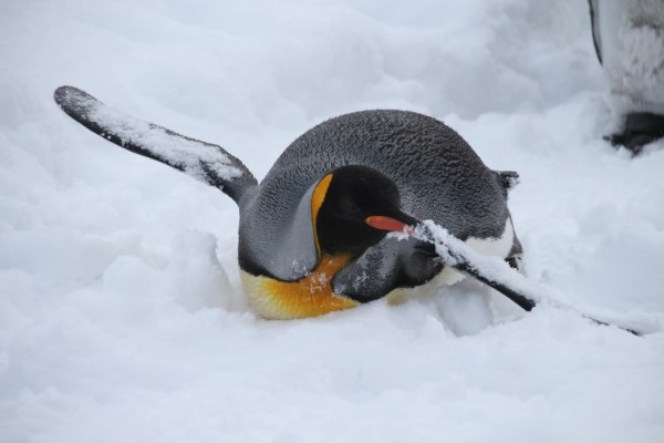 うひょひょー!と身体全体で新雪を楽しむ旭山キング。こんな散歩スタイルも見られます。腹這いになって進む『トボガンすべり』と呼ばれる動きをしているはずなんですが、雪が深いので、足で雪を掻き上げるだけになってしまい、あまり前進しません。