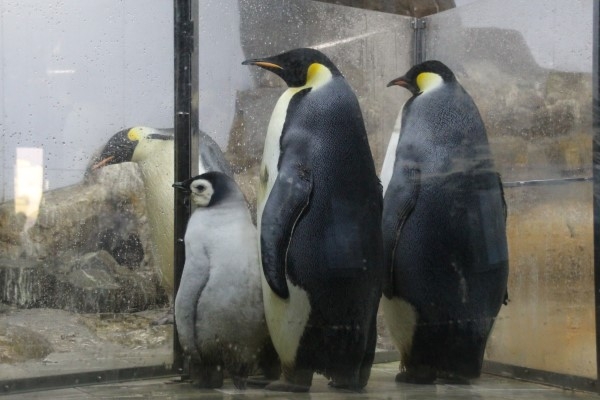 しみじみとファミリールームの外を眺めているエンペラーひな一家。@アドベンチャーワールド