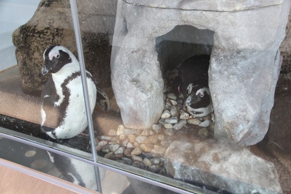 京都水族館のケープ、こちらは戸建てにおさまっているペアです。戸建ての巣小屋は観覧通路側を向いています。こうすることで、部外者ペンギンの干渉を減らすことができます。ペンギンたちはどの種でも、アクリルガラスの効果を理解しているようです。アクリルの向こう側から手出しされることはありません。