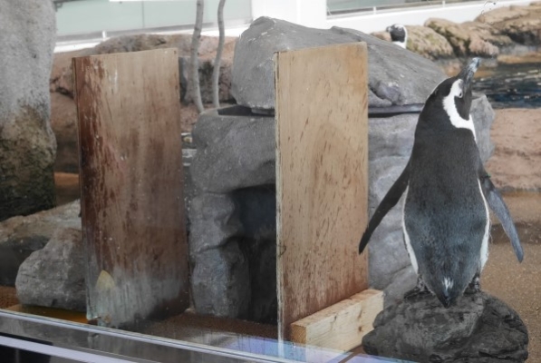 こちらは京都水族館の戸建てペンギン住宅改良型でございます。巣の入口をアクリルガラスに向けるだけでなく、入口両側に壁を立てています。壁とアクリルの間は1羽がぎりぎり通れるだけの隙間になっていて、部外者ペンギンの侵入をさらに防ぎやすくなっています。ペンギンの住宅もセキュリティーの時代です。