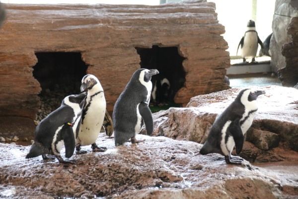 京都水族館にはペンギン集合住宅もあります。たぶんFRP製で、巨木の幹を模した形をしています。中は壁で仕切ってあります。ケープたちは戸建てタイプとどちらがお好みなのでしょうね。