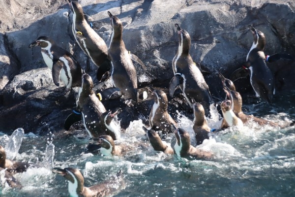 葛西のフィーディング、続きです。崖が少し低いところでは、水面から盛り上がった勢いで上陸してくるフンボルト。もう、飼育員さんが喰われそうな凄まじさです。ですが、フンボルト用のサカナはプールに投げ入れられるので、上陸してどうするのかな?