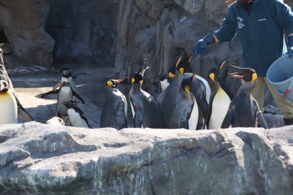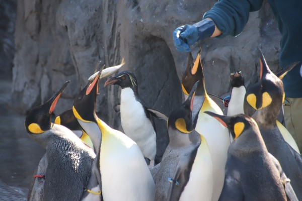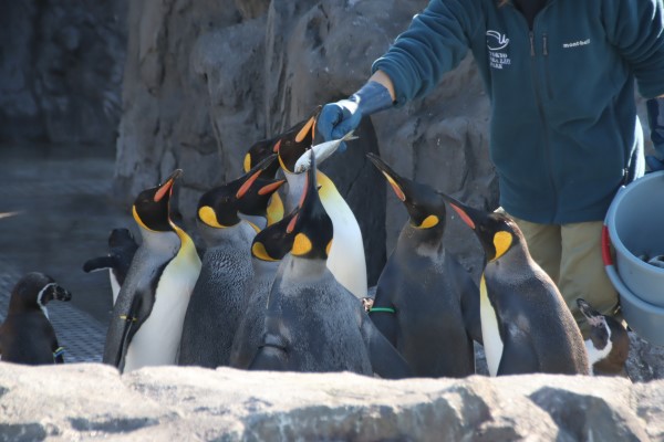 葛西のフィーディングタイム、フンボルトの次はキングの番です。一ヶ所に集まり、1羽ずつ手渡しでサカナをもらいます。
