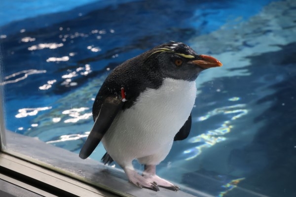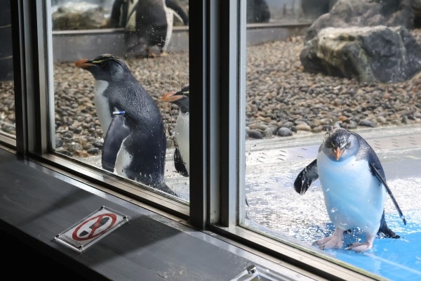 さて、越前松島水族館でキングとジェンツーを困惑させているイワトビ集団は、もちろんそんなことは全く知らずに思うままに活動します。窓のプール際すぐ内側に立つ彼ら。その足もとを見ると、