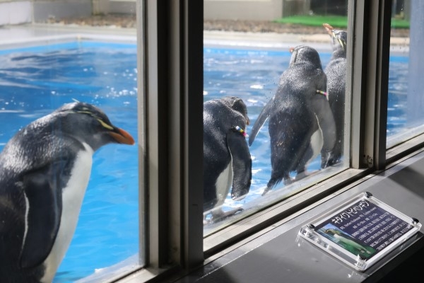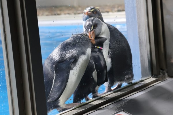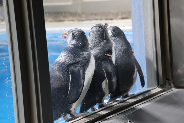 前回の写真で、窓際で遊んでいたイワトビたち。詳しく見ると、こんな様子です。陸場の床から窓枠に飛び乗り、行列して歩く。