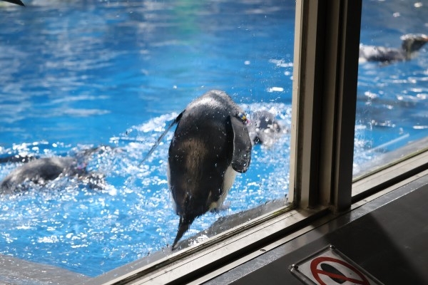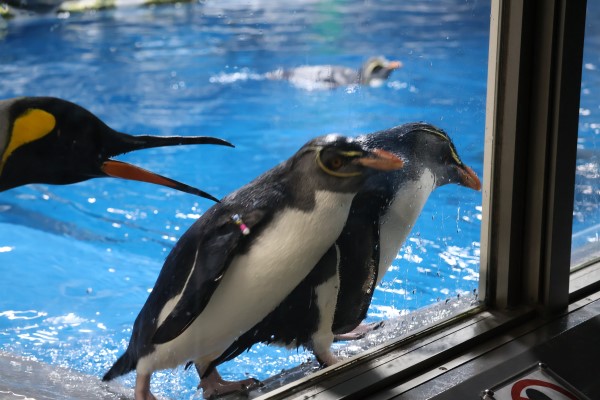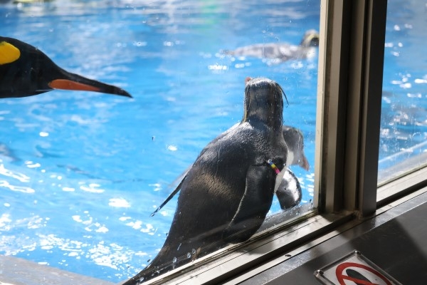 さて、越前松島水族館の新入イワトビたちが元気に遊び騒いでいると、いきなりキングがクチバシ攻撃を! 現場すぐ近くをお気に入り場所にしているペアの奥方様です。よほどうるさかったのでしょう。