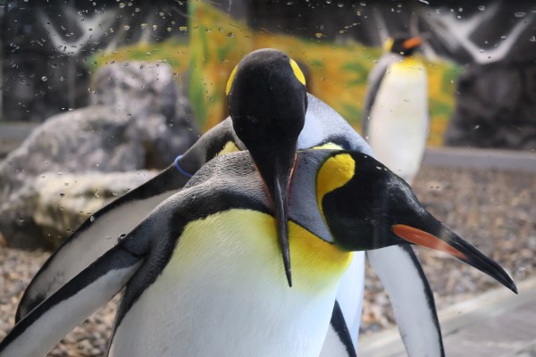 後ろから仲間の頭を攻撃するキング、イジメか?!と思われそうな場面です。が、ご安心ください、奥方様キングが夫君キングにイチャつきを仕掛けているのでございます。たぶん遊んでいるのでしょう。