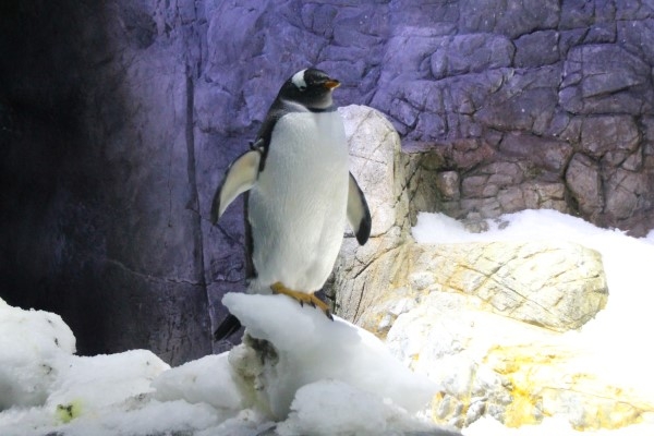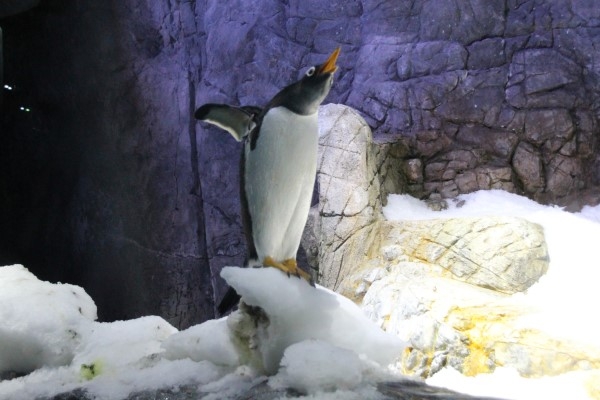 海遊館のジェンツー、雪塊の上でのびをしていると『なんともなお顔』ですが、