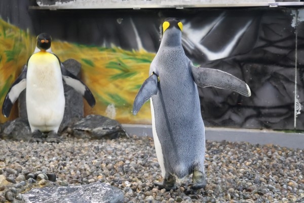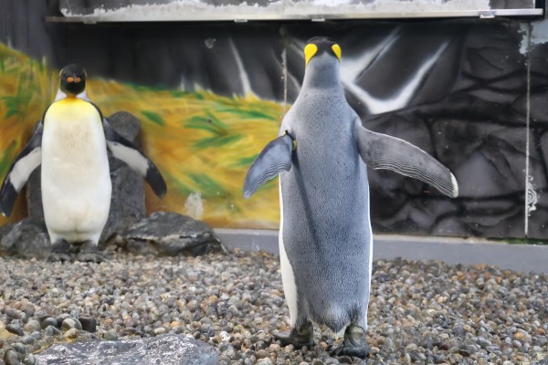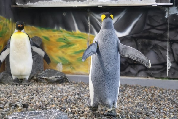 右足の『かかと』があがり、左足に体重がのりました。本当に人っぽい動きです。フリッパーを広げているのがヒトと違いますが、フリッパーを体側につけて歩くこともあります。エンペラーだと、フリッパーはめったに広げません。寒さ対策が習性になっているのでしょう。