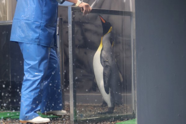 はい、ここでお待ちください。扉が閉められます。じっと飼育員さんを見上げる新人キング。