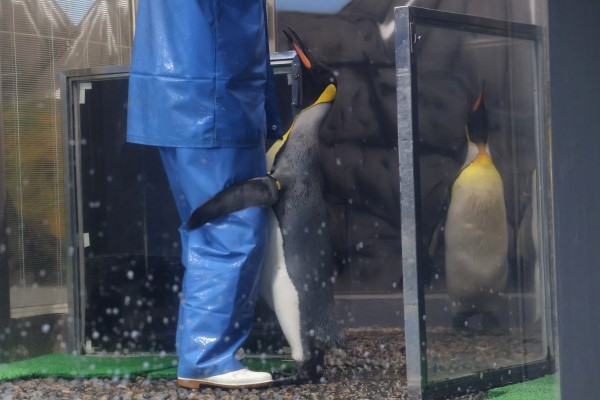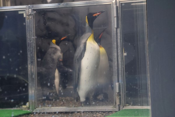 ここはお散歩に出るペンギンの控えエリアです。先輩たちは声を掛けられると集合して、出番を待ちます。首を伸ばしているのが新人キング。緊張しているのでしょう。