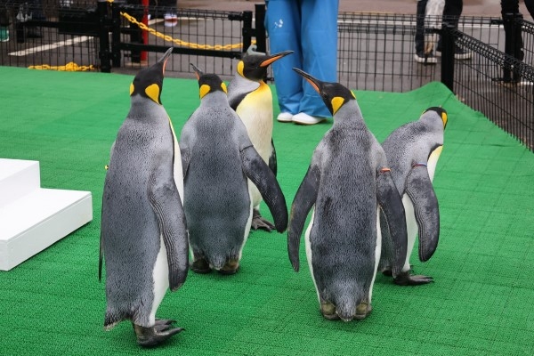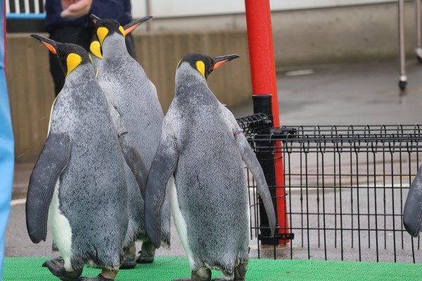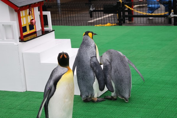 先輩たちについて外に出てきた新人キング、特に問題はなく広場に到着しました。左手前の大きな個体が新人君です。越前松島水族館の名物『ペンギンの初詣』練習なのです。