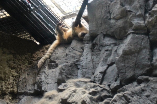 丸太につかまってぶら下がっている・・・と思ったら、岩のでっぱりに寝ころんで丸太にしがみついている、長いシッポのこの生き物はだれ?海遊館のアカハナグマです。鼻が赤いのではなくて、赤っぽいハナグマなのだそうです。