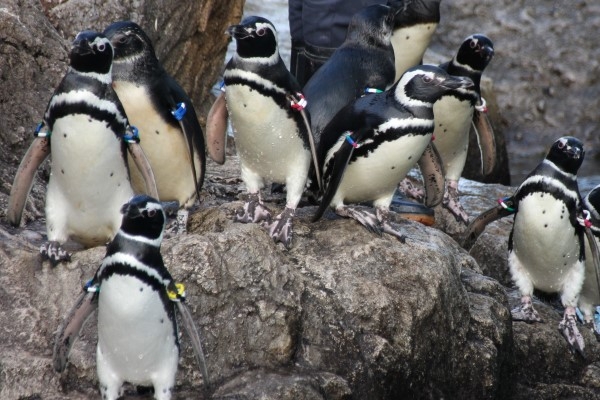 上越水族館のマゼラン、プールぎわの岩に集まっていました。マゼランは胸に二本線。顔の周囲に白線があるのはケープと同じですが、白線は細め。そしてケープより『おちょぼ口』な傾向あり。
