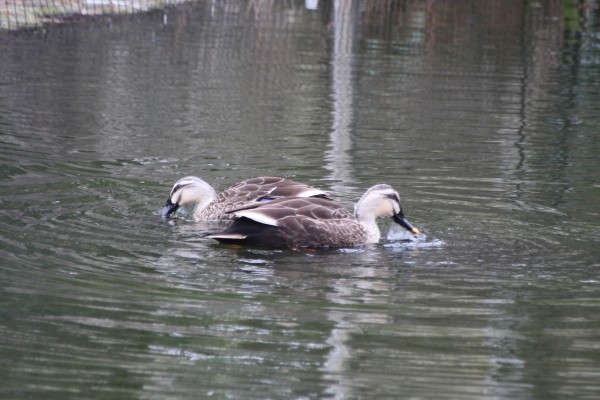 お~、カルガモの夫婦です。目が細長くて怖い?ふうに見えますが、これはお顔の模様。黒いラインの真ん中あたりに丸い目があって、かわいいです。