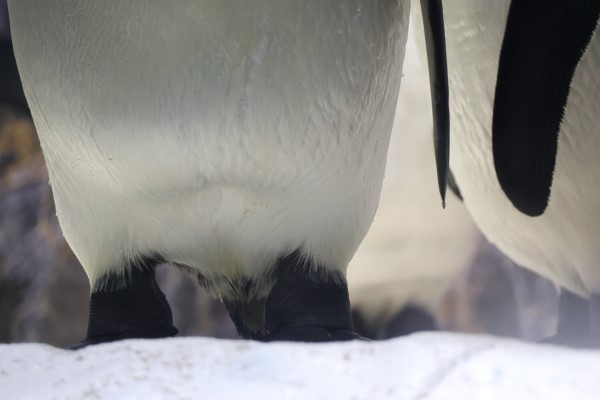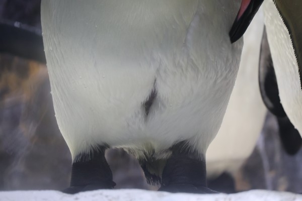 海遊館のキング、羽づくろい中です。ハラが割れている!? じつはこれがペンギンの『抱卵嚢』、抱卵するためのポケットです。ですが、穴が開いているのではなくて、羽毛が生えてなくて皮膚が露出しているのです。皮膚は伸びますので、立った状態で足の上に置いたタマゴに皮膚をフィットさせ、体温を伝えて温めます。ですが、