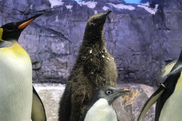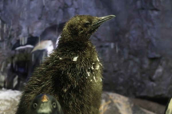 海遊館のキングひな、お母さんのところから離れました。ある程度大きくなると、ときどきお出かけしてみることも。胸のあたりに白い斑点がみえるのは、人工雪がくっついているのです。手前に映り込んだアデリーが、ちょっとホラー顔ですね。