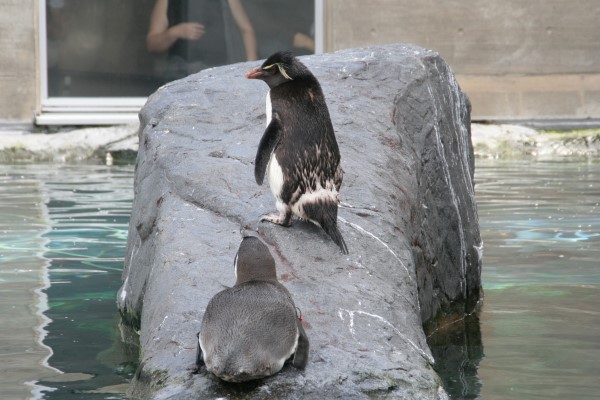 旭山動物園、プールの小島でフンボルトvsイワトビ対決みたいになっています。くつろぎフンボルトがいるので、イワトビが降りられないのか?
