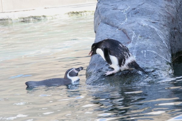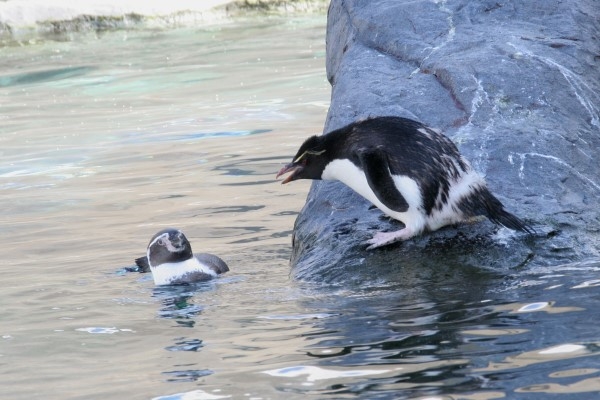 旭山動物園、前回の続きです。水に入ったフンボルトが小島に近寄ると、岩の上から追い払うイワトビ。さっきの仕返しでしょうか?