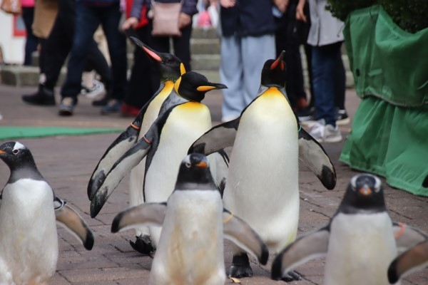 登別のペンギンパレード、堂々と帰路を歩くキングとジェンツー。ところで留守番キングは、仲間が出場している間は何をしていたのでしょう?