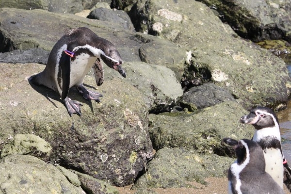 砂浜に出たフンボルト集団、続々と海に入っていきます。長崎ペンギン水族館のペンギンビーチ。ペンギンたちは午前中に浜に出て、午後まで海で過ごしていました。