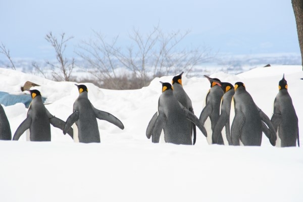 冬の旭山動物園といえば、キングの散歩。ここ数年は日本語よりも外国語の方がたくさん聞こえてくるみたいな感じですが。これはずいぶん昔の様子で、お散歩コースも今とは異なります。ペンギン専用道の向こう、薄青い空の下に旭川の街が見えています。