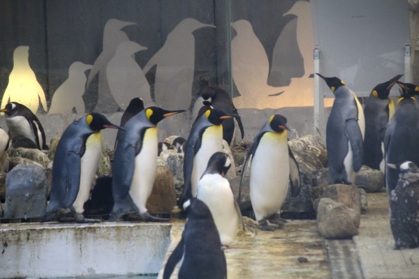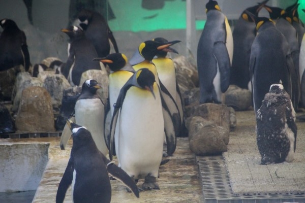 ガラスに描かれたペンギンのシルエットそっくりの様子で、キング集団がプールのフチを歩いてきます。角を曲がって、少し広い通路に出ます。