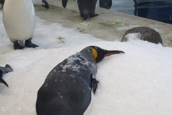 カキ氷の山にハラをうずめて、しみじみとヒンヤリ感を味わうキング。アドベンチャーワールドのペンギン王国2F。