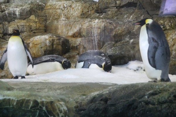 左端の立っているペンギンはキング、他の3羽はエンペラーです。色がよくわからなくても、体格と体型が違うので区別できます。キングはスリムですし、身体のサイズに対してフリッパーが長いです。