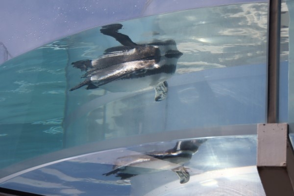 越前松島水族館のハート形リングプール、見上げれば青空を背景にフンボルトが泳ぎます。写真のフンボルトは何羽いるでしょう?