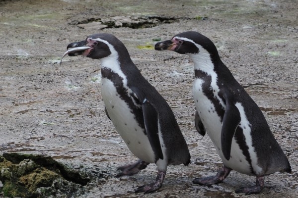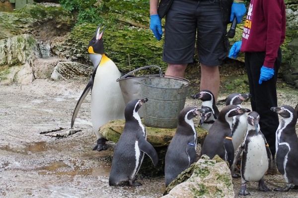 ゲートから移動してお食事会場に着いたペンギンたち、さっそくサカナをいただきます。有料イベント給餌体験の少年からも、平気でもらっています。キングには大きなサカナ、色合いから見て、小型のタラの仲間ではないかと思います。