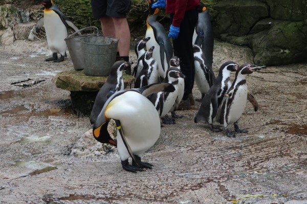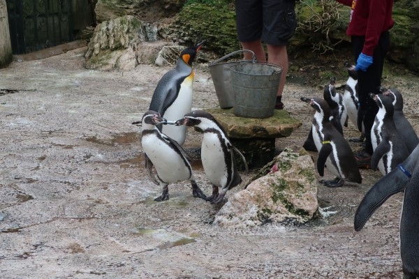 1羽離れてお尻のあたりを羽づくろいしているキングは、もう食べちゃったのです。奥の方に立っているキングも、「ご馳走様でした」でバケツから離れました。どこまでも食べる、ということはなくて、適量を心得ているようです。キング2羽とフンボルトはまだお食事中。