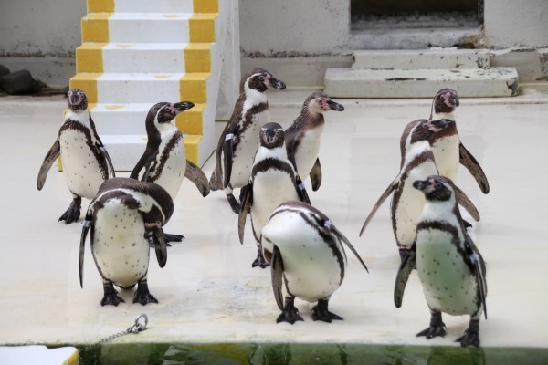 おたる水族館のフンボルト、それぞれにゴマ点模様や胸一本線の太さが違います。亜成鳥もいますね、お顔が白くて一本線がありません。