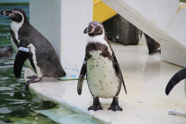1羽、こんな模様の個体を発見。フクロウか何かの顔みたいに見えます。南知多ビーチランドのフンボルトにも、よく似た柄の個体がいます。もしかしたら、ご親戚か、異動したか、かも?