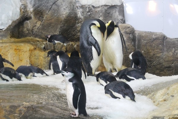 今回はエンペラーとアデリーで比べてみましょう。同じくアドベンチャーワールドのエンペラー、ペアで仲良くしているところで頭を下げていますが、それでもアデリー(手前だけヒゲ)との違いは目立ちます。エンペラーの体重は30kg、大きい個体だと40kgになるそうです。