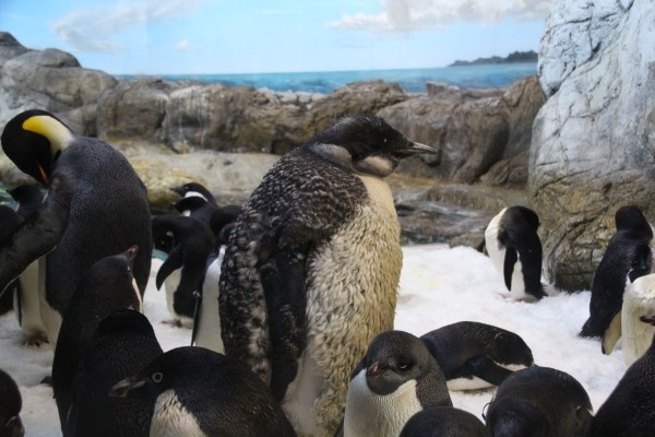 この部屋にはエンペラーの若様方が御同居、まるで保育係のようなサイズにおわします。中央のもさもさは、亜成鳥から成鳥へと換羽中のエンペラー最年少個体です。けっして、アデリーが育つとこうなるのではありません。数年前のアドベンチャーワールドでした。